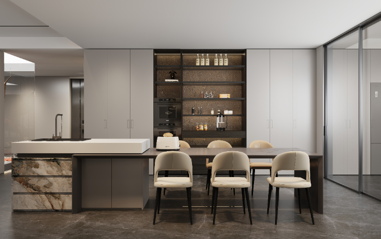 島臺餐桌形成一個整體,讓餐廳的功能性大增。這里不限于用餐,還能作為日常休閑的茶吧或西廚料理烘焙臺,甚至可作為臨時辦公場所,相較于單獨的餐桌,該設計讓空間利用率更高。