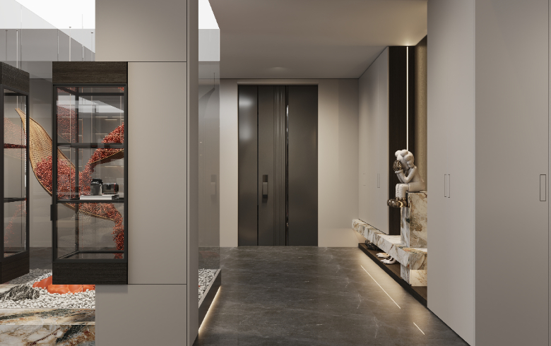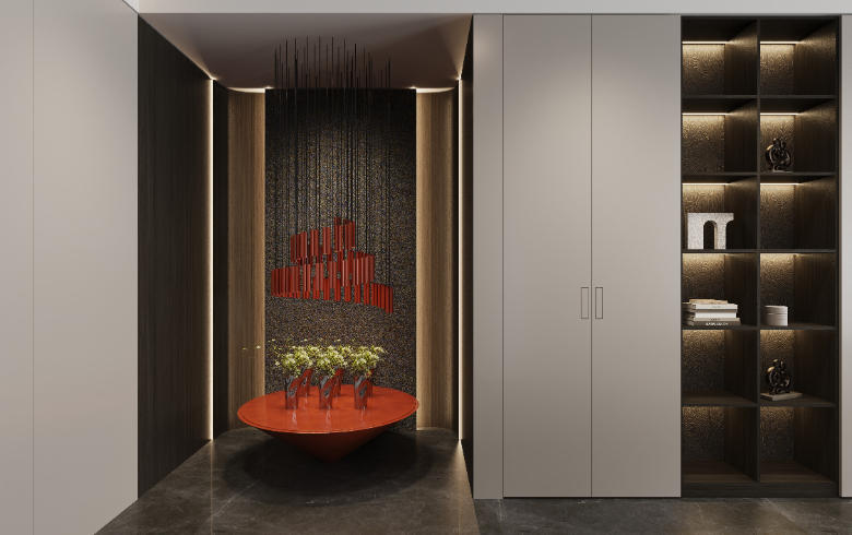 通頂玄關柜橫向延伸,收納翻倍。底部懸空方便換鞋,提升入門整潔度,地臺加持,高級加倍;中部鏤空開放,擺設飾品,放置出門必備物,生活的并井有條從歸家開始。