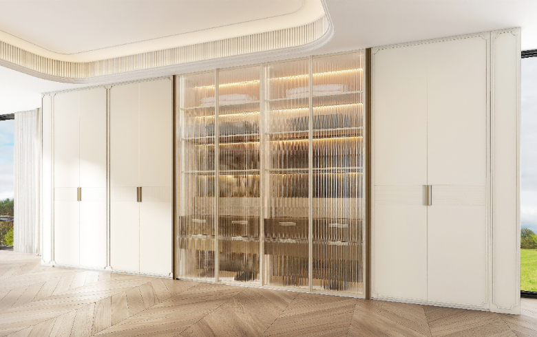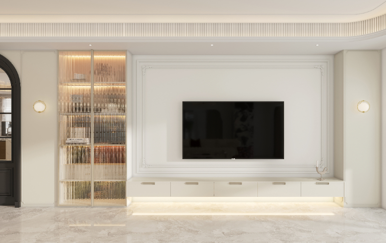 想空間不壓抑,左右對稱的餐酒柜柜門裝上長虹玻璃,忽隱忽現(xiàn)的美感更誘人。
