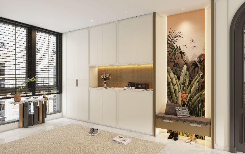 古典的優(yōu)雅氣場,融入自然的生機,靜待時光歲月靜好。入戶柜由高柜和懸浮柜組成,足夠放下一家人的鞋子,還可以收納家政雜物。