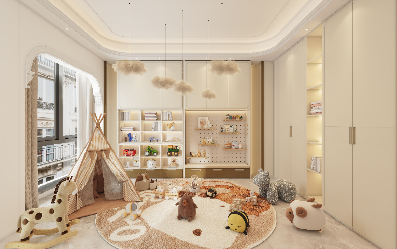 玩樂區(qū)放滿各種洋娃娃,守護天真爛漫的童年。暖色調現(xiàn)代感的兒童房,大面積的落地窗,明快的配色,既能培養(yǎng)孩子開闊的胸襟,也有利于增加他的擴散性思維和創(chuàng)新意識。