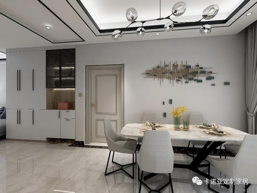 客餐廳一體化,以鞋柜為界,將整個(gè)空間劃分成兩個(gè)區(qū)域,既協(xié)調(diào)又統(tǒng)一。