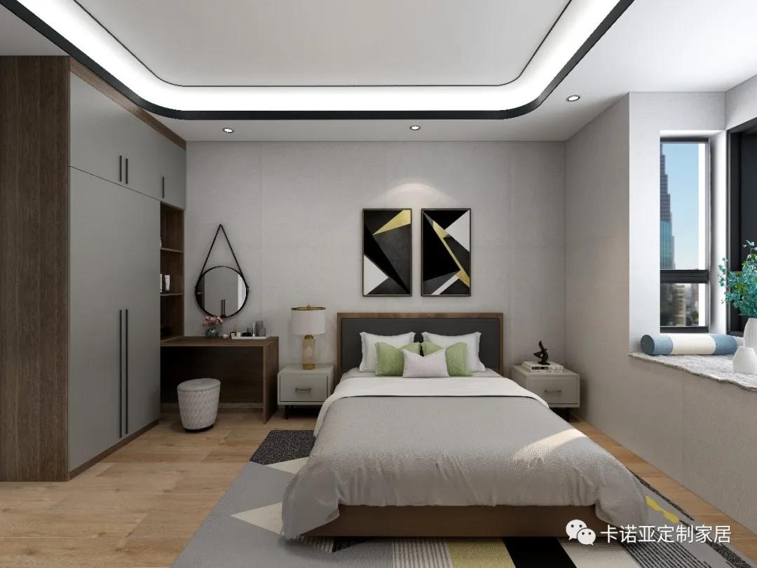 大面積留白是主臥的主視覺,溫潤的床品,簡單的射燈,營造出寧靜淡雅的睡眠環(huán)境。