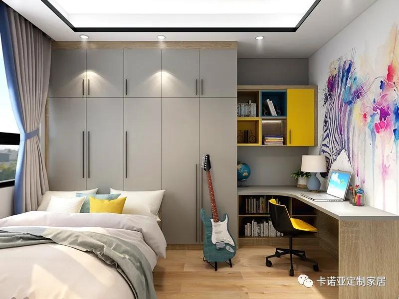衣柜與書桌、書柜一體化,為孩子騰出更多自由活動(dòng)的空間,既滿足了小孩的學(xué)習(xí)效率、收納需求,又讓原本狹長的兒童房更顯整齊、開闊、明亮。