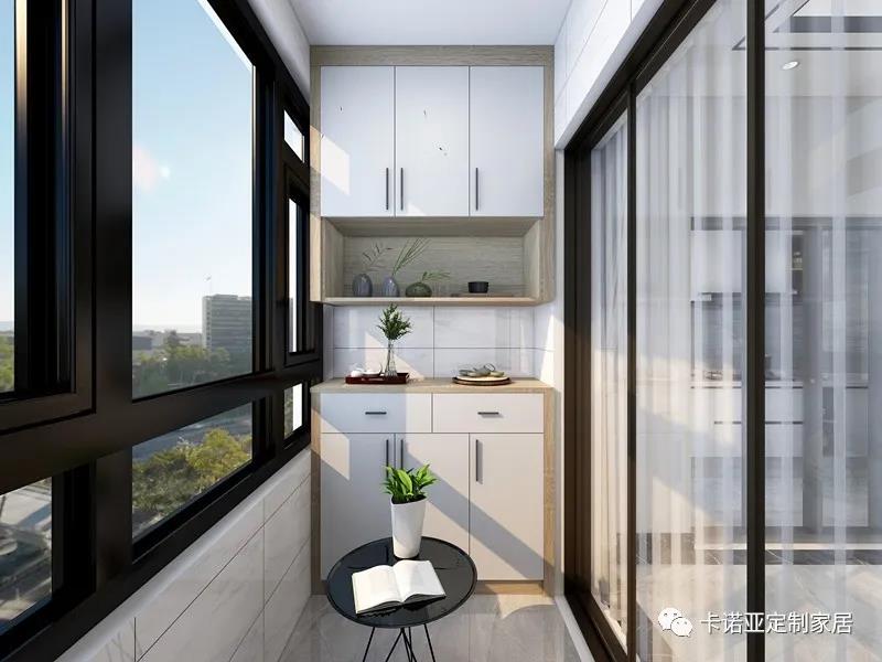 生活陽臺(tái),同樣利用陽臺(tái)的戶型結(jié)構(gòu)定制了一個(gè)三段式陽臺(tái)柜,減輕室內(nèi)收納壓力。