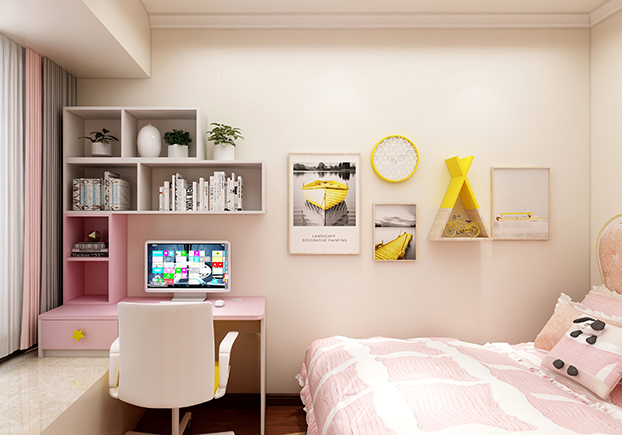 ▲小朋友的房間比較明亮,童趣十足,水天藍(lán)和公主粉的設(shè)計再搭配明亮黃,瞬間輕快明亮,功課區(qū)和休閑區(qū)的設(shè)計,書桌功課做完立馬可以在休閑區(qū)玩耍,一房多用,小朋友們表示很喜歡自己的房間。