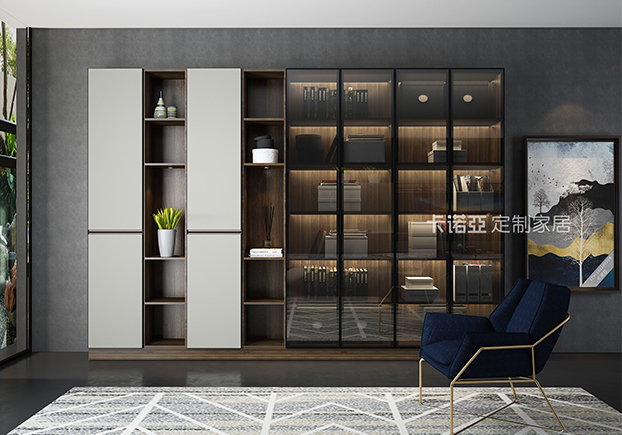 電視柜半開放設(shè)計(jì),黑框金屬玻璃門的搭配使得整個(gè)空間更富有立體感。