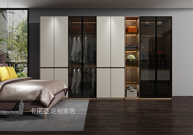 臥室比較沉穩(wěn)大氣,玻璃門半開放式衣柜黑白相間,空間空曠開放,有點(diǎn)極簡(jiǎn)風(fēng)。