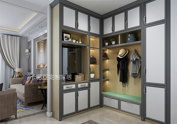 為了防止空間不足,設(shè)計(jì)師做了到頂處理,開(kāi)放空間用于放置傘、手表之類(lèi)的出門(mén)必備物品。