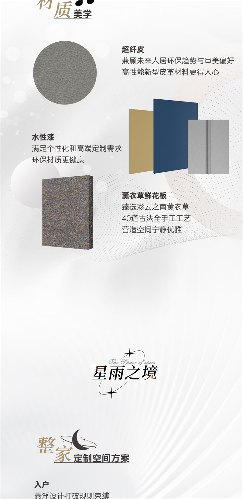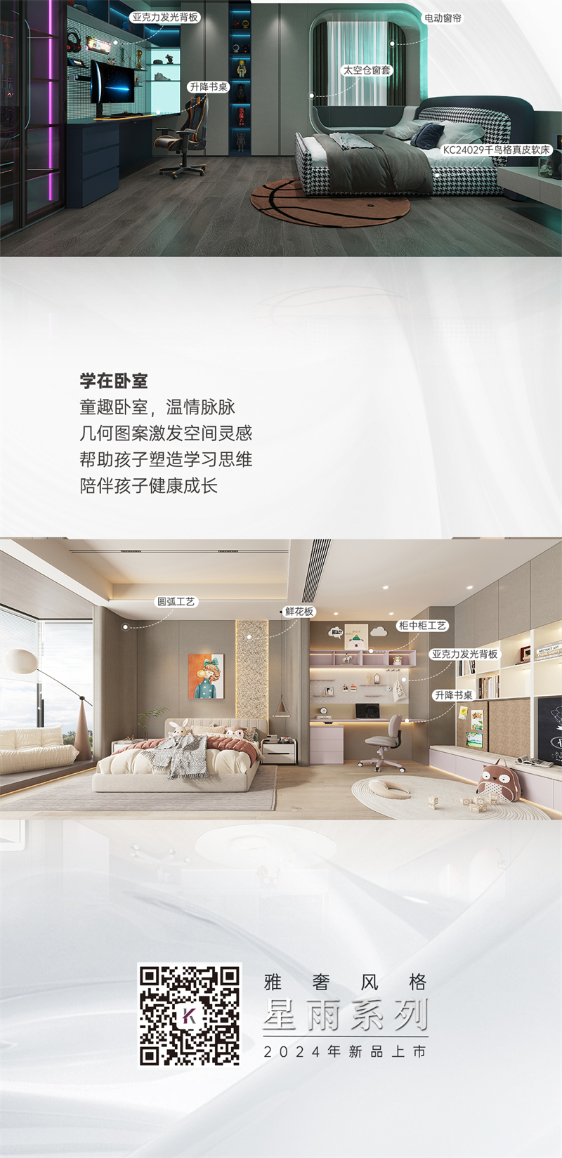 2024年新品系列,星雨 |雅奢風格 該系列產(chǎn)品采用柔和的色彩搭配和浪漫的元素點綴,打造溫馨浪漫的家居氛圍。學在臥窒:童趣臥室,溫情脈脈,幾何圖案激發(fā)空間靈感,幫助孩子塑造學習思維,陪伴孩子健康成長