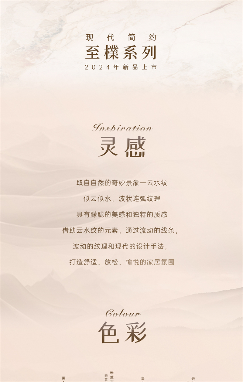 2024年新品系列,至檏 |現(xiàn)代簡約風(fēng)格 借助云水紋的元素,通過流動(dòng)的線條,波動(dòng)的紋理和現(xiàn)代的設(shè)計(jì)手法,打造舒適、放松、愉悅的家居氛圍。