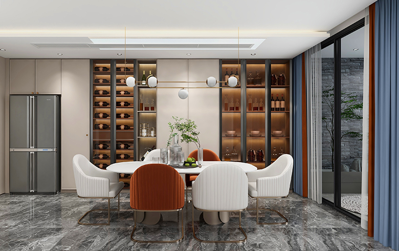 餐邊柜靠墻定制,空間有效利用,隱梁隱柱,雙門冰箱嵌入式,整體視覺更統(tǒng)一。餐邊柜延續(xù)客廳配色,“優(yōu)雅暖灰”柜門+“流光漫步”柜體,加入玻璃門、燈帶,唯美展示名酒,彰顯不凡品味。