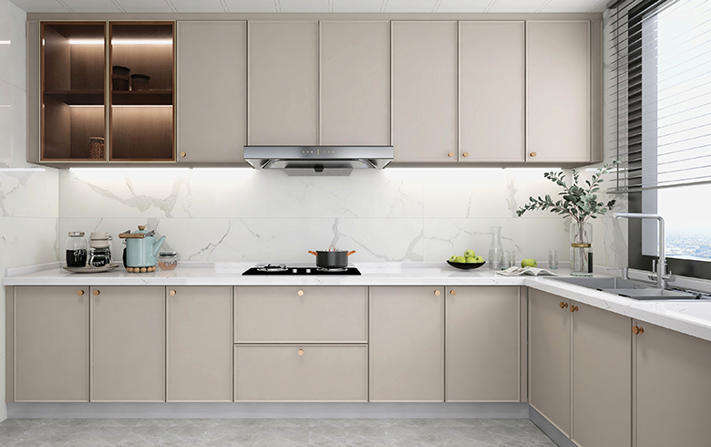 長條形廚房定制L型廚柜,轉(zhuǎn)角不浪費(fèi),大量的地柜、吊柜,炊具刀具調(diào)料通通隱藏,讓臺(tái)面保持整潔。吊柜中加入玻璃材質(zhì)+燈帶,一改整堵墻封閉式柜子的壓迫感,下廚多了一份輕盈。應(yīng)用高級“優(yōu)雅暖灰”,瞬間營造高端廚房印象。