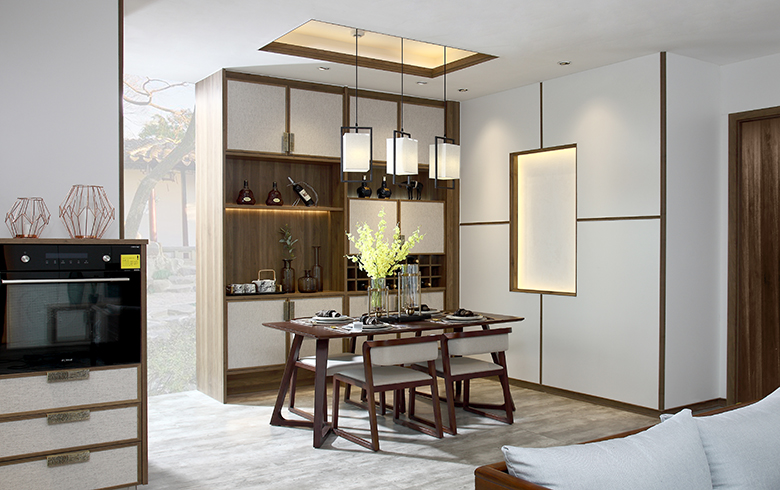 君子遠離庖廚,煙雨江南廚房讓人愛上下廚。新中式廚房更注重實用性,L型廚柜設計科學合理的操作動線,遵從洗、切、炒的料理順序,讓美味佳肴在行云流水的烹飪中輕松搞定。