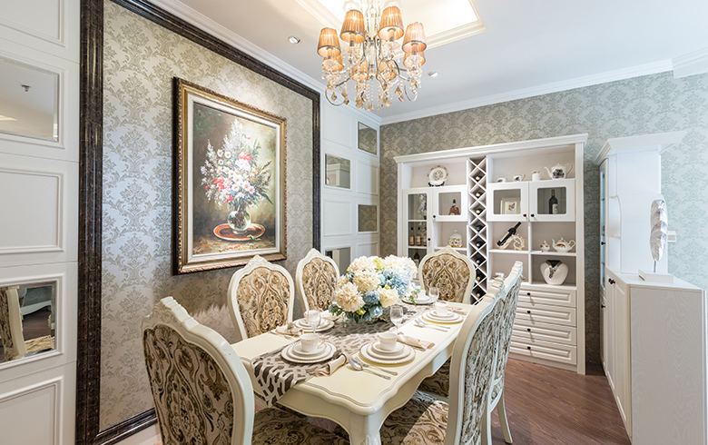餐廳充盈著白色的純粹,如初戀般純凈與美好,橡木錯(cuò)落有致的紋理,帶來別樣精致的質(zhì)感。家具中流暢線條的寫意設(shè)計(jì),看似隨意刻畫的簡歐風(fēng)情卻表達(dá)得恰到好處。