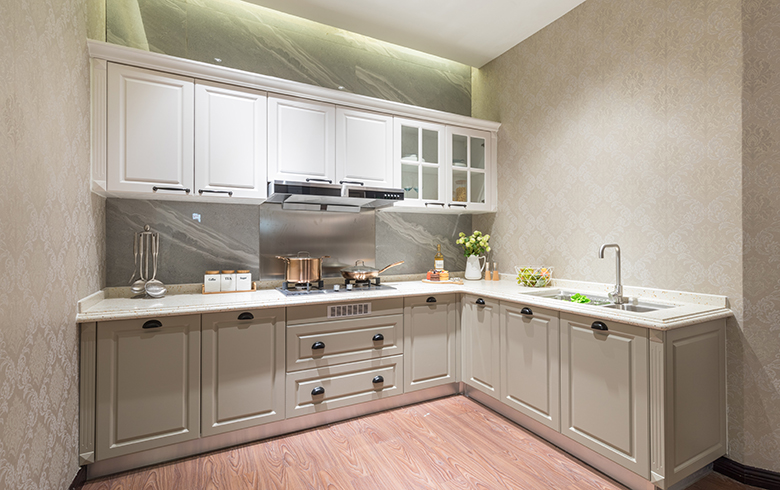 廚柜采用白色和淺灰色為主要配色,烘托空間的優(yōu)雅氣質(zhì)。歐式淺色印花墻紙,與廚柜門板既相互融合,又能體現(xiàn)出層次間的落差美。