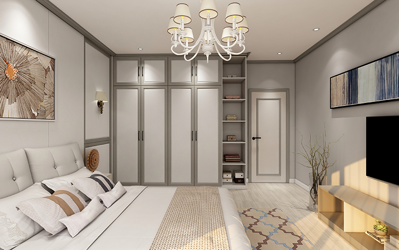 簡(jiǎn)歐風(fēng)格特有的方正造型灰色邊框的木門,一改木門平面單一的視覺印象,同時(shí)與到頂衣柜、護(hù)墻板在紋理及材質(zhì)上相呼應(yīng),整體空間寧靜素雅,溫暖直抵人心。