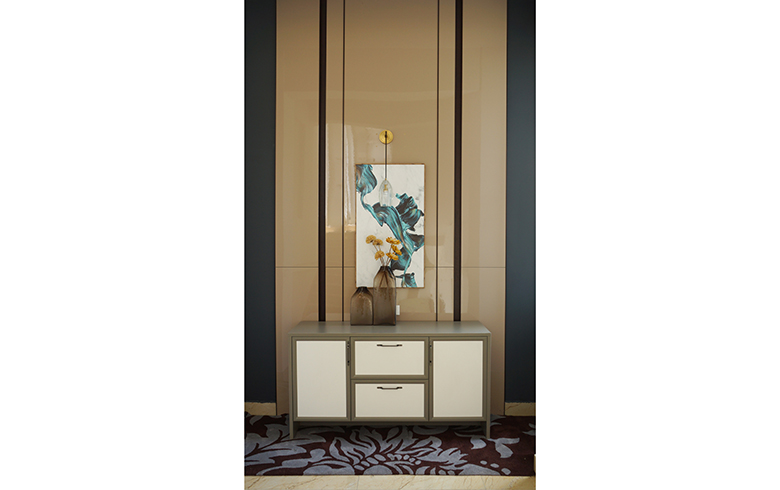 護墻板漢白玉的淺灰、墻面油漆的中性灰、大面積漢白玉護墻板拼貼的深色灰色塊,三種不同飽和度的灰和諧融合,白色點綴,演繹出美輪美奐的空間氣質(zhì),具有非常震撼的感染力。