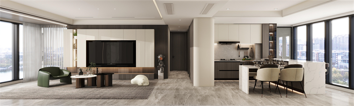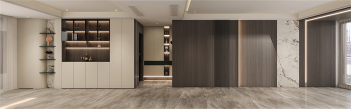 這是一個三口之家,客戶是都市精英人才,對生活充滿了熱愛,對品質(zhì)有著極高的要求,所以本方案主要以高級灰木紋色為主,搭配溫柔典雅的水性漆雅杏,給客戶營造一個親近自然,同時又不失奢華的溫馨舒適的空間。廚房在原有的空間上做了一個大膽的改造,打造了一個中西結(jié)合的開放式廚房,空間更大,功能更齊全。同時一些墻角和柜體也做了圓弧設(shè)計,動線更加流暢的同時,更顯時尚和高級。