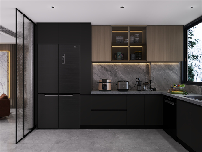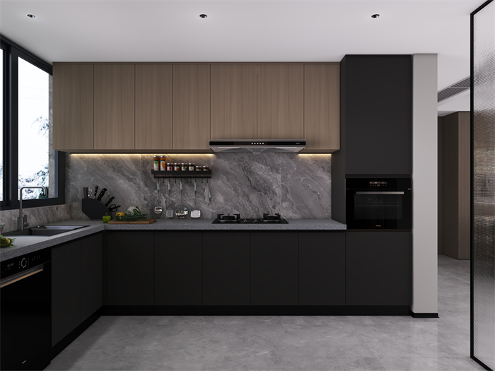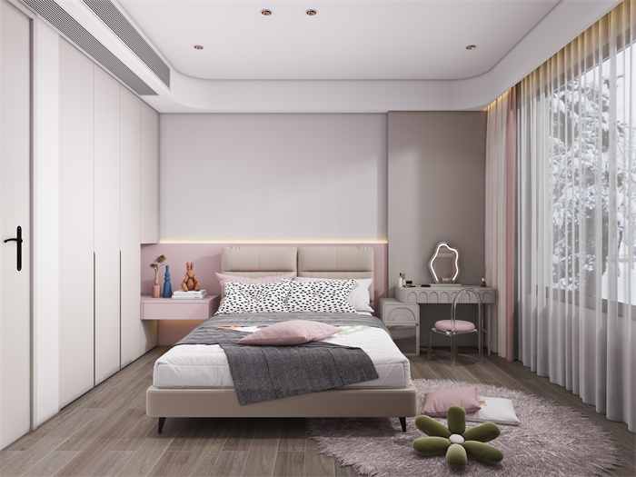 家具選擇上,以簡約現(xiàn)代風格的家具為主,注重舒適度和功能性。軟裝細節(jié)上,采用柔和的色彩和材質。廚房注重實用性和便利性,采用嵌入式收納設計,最大化利用空間,營造一個干凈整潔的烹飪區(qū)域。臥室以舒適為設計重點,采用柔和的色調和舒適的床品,營造令人放松的休息空間。充分利用儲物空間保持整潔有序。