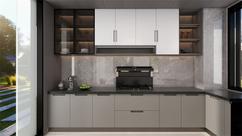 吊柜和地柜分別搭配“晨露白”和“薄暮灰”,中間輔以大理石紋,暖意徜徉,煙火氣撲面而來(lái)。整體視覺(jué)干凈大氣,玻璃門(mén)點(diǎn)綴,增強(qiáng)視覺(jué)通透感與層次感。