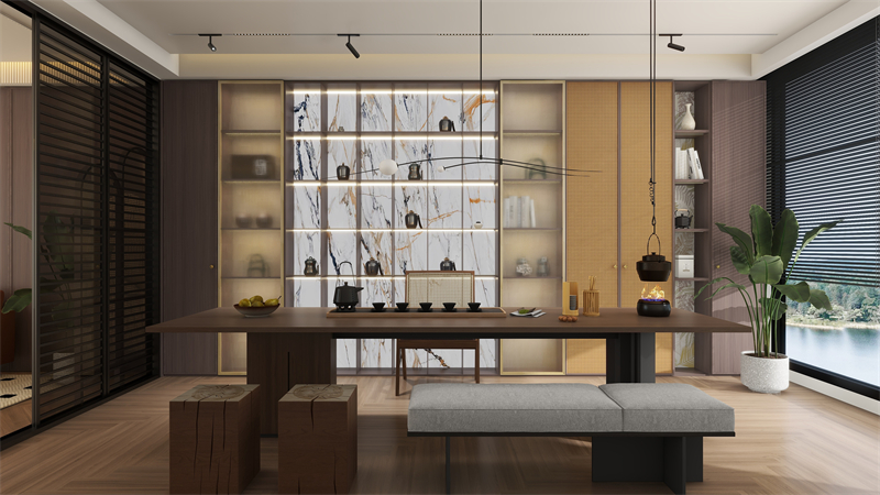 在清淺時(shí)光里,一手煙火一手詩(shī)意,任窗外花開花落,云來(lái)云往,自是余味無(wú)盡,萬(wàn)般愜意。茶室以素色調(diào)為主,深色的天然紋理厚實(shí)而流暢,打造質(zhì)樸的空間,帶來(lái)的不僅僅是原始的茶味,更是一種隨性的灑脫意境。