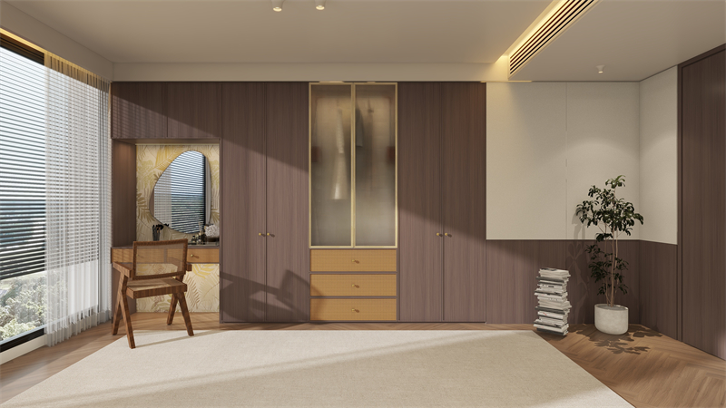 整個(gè)空間以深色木紋打底,大面積的木紋拼框柜門,既保留中古經(jīng)典特色,也兼?zhèn)涔诺渑c現(xiàn)代美感。衣柜局部應(yīng)用長(zhǎng)虹玻璃,嵌入梳妝臺(tái),搭配內(nèi)嵌燈帶,透光不投影的朦朧感,驚艷每一天。
