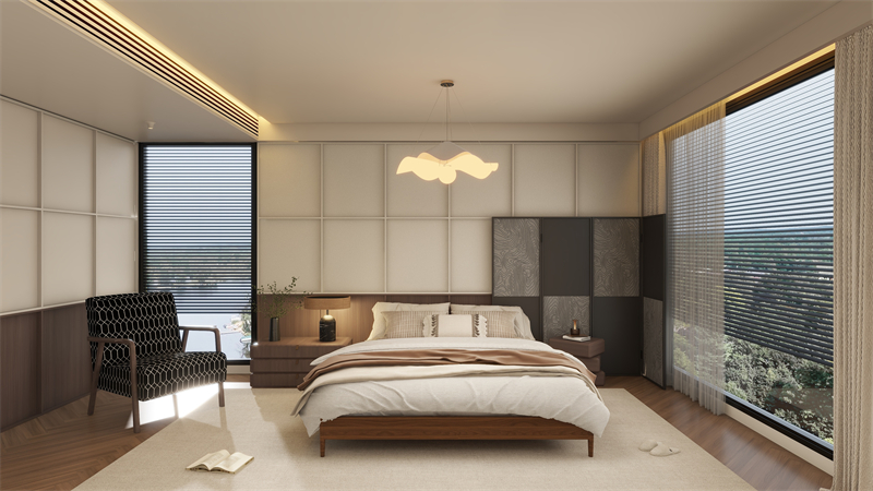 溫潤(rùn)柔和的臥室空間,捕捉記憶與情感的詩(shī)意,陳述著過(guò)去與未來(lái)的情愫。床頭背景墻采用凹凸有致、細(xì)膩流暢的骨骼線與拼色護(hù)墻板,讓空間呈現(xiàn)多維立體的藝術(shù)美。落地窗讓陽(yáng)光灑進(jìn)來(lái),整個(gè)空間都亮了起來(lái),感覺走進(jìn)了溫暖的夢(mèng)境。