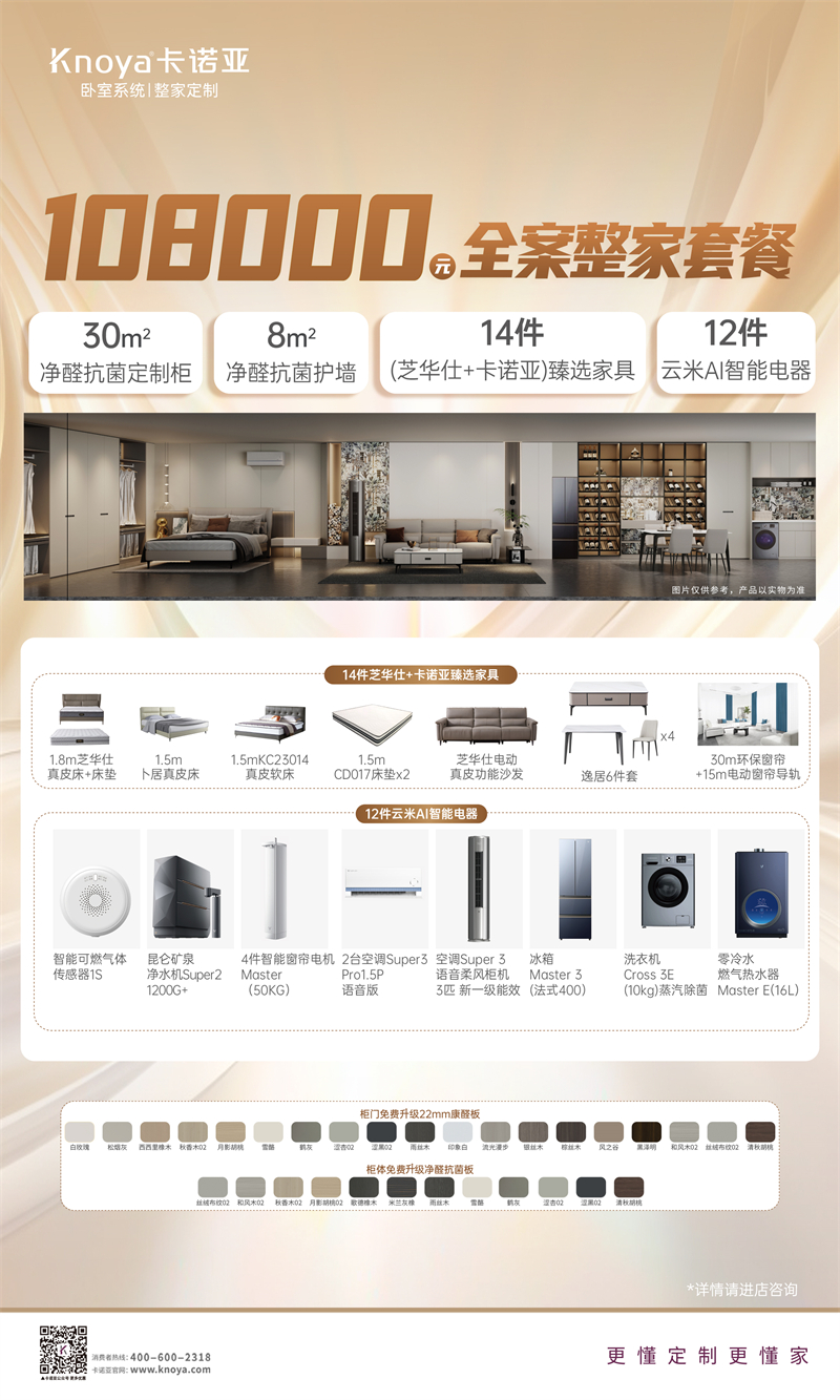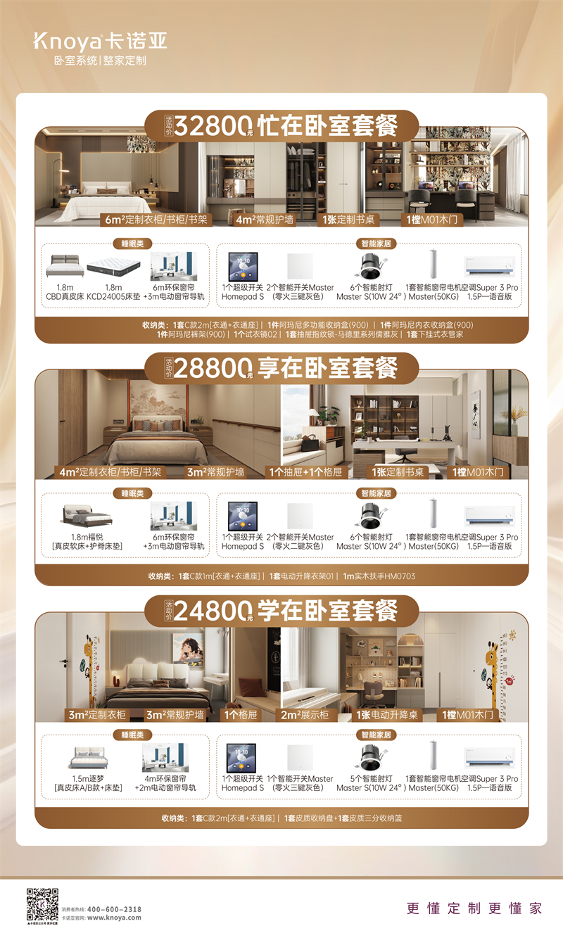 本次活動,卡諾亞還特別推出32800元忙在臥室套餐、28800元享在臥室套餐、24800元學在臥室套餐等,涵蓋臥室系統(tǒng)+整家定制2大品類,包含定制柜、護墻板、全屋家具及智能家電,同時攜手芝華仕、CBD、云米科技等多個高端品牌,致力于為消費者打造舒適、便捷且極具品質感的理想臥室空間。