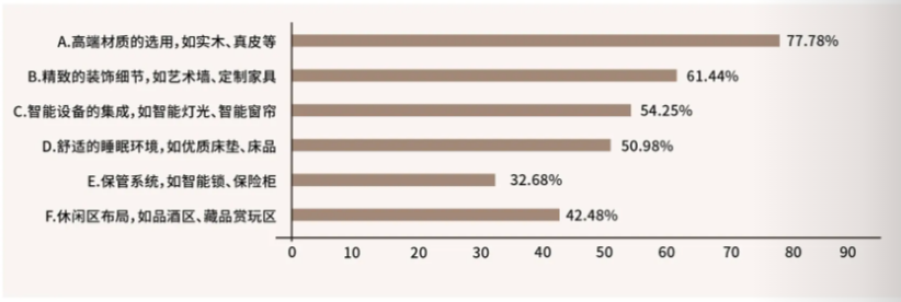 《中國臥室生活方式洞察報告》顯示,臥室生活占據(jù)人生至少三分之一的時間,其舒適度和功能性對提升生活質(zhì)量至關(guān)重要,不同人群對于臥室生活的需求是不一樣的。在打造高品質(zhì)臥室方面,高凈值人群尤其注重高端材質(zhì)的選用、精致的裝飾細節(jié)以及智能化設(shè)備的應(yīng)用。具體來看,77.78%的受訪者認為高端材質(zhì)不可或缺,61.44%的人認為精致細節(jié)同樣重要。