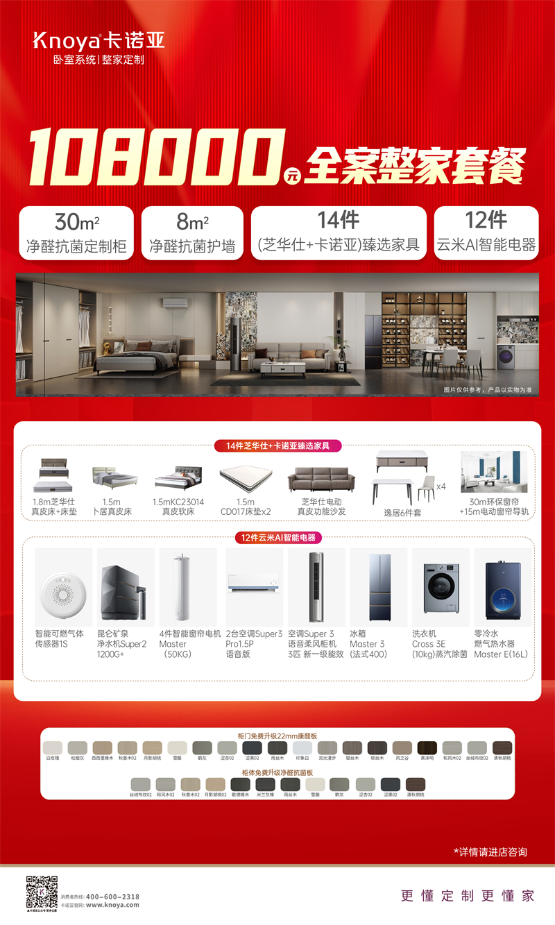 品質(zhì)生活,從臥室開始。本次活動,卡諾亞攜手芝華仕、CBD、云米科技等多個知名品牌,傾情推出32800元忙在臥室套餐、28800元享在臥室套餐、24800元學(xué)在臥室套餐等,整合臥室系統(tǒng)定制+高端整家配套,包含定制柜、護(hù)墻板、家具家品及智能家電,一站式打造舒適睡眠、智能便捷、格調(diào)美學(xué)、高效收納兼?zhèn)涞钠焚|(zhì)休憩空間。