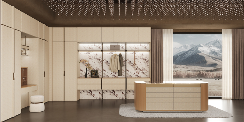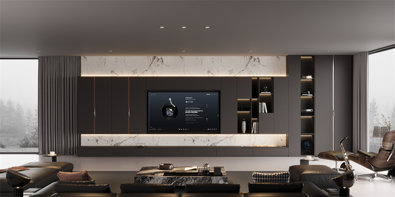 ·材質(zhì)對話:直紋肌理板材與澀黑柜體形成深淺對比,數(shù)碼打印出來的紋理如大理石般通透,鋁木玻璃柜將金屬堅韌與木材溫潤完美結(jié)合。