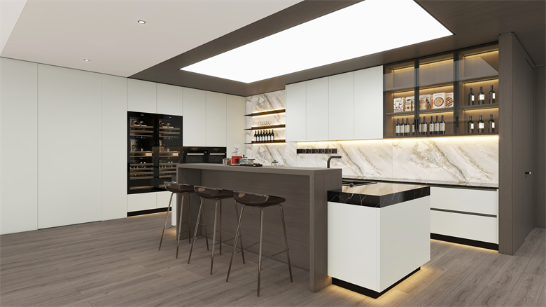 細節(jié)處亦見匠心,魔方皮紋內(nèi)嵌拉手門型搭配拉絲黑拉手,將極簡融入基因,門板與拉手渾然一體;可選配的海蒂詩、百隆等進口鉸鏈,讓每一次開合都安靜順滑,這份 “看不見的用心” 正是其 “懂設計” 的底氣。