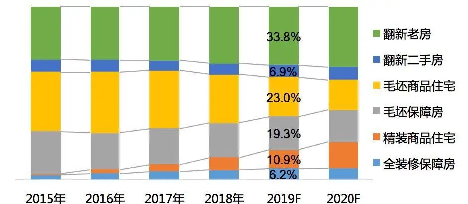 事實(shí)上,趨勢(shì)早已顯現(xiàn)。權(quán)威調(diào)研數(shù)據(jù)顯示,從住宅裝修市場(chǎng)的產(chǎn)值結(jié)構(gòu)來(lái)看,老房及二手房翻新市場(chǎng)在2019年合計(jì)占比超過(guò)40%,2020年將超過(guò)42%。而毛坯商品住宅市場(chǎng)的比重持續(xù)下降,2019年預(yù)計(jì)略低于23%,2020年可降至17.6%,毛坯房市場(chǎng)在2020年也將低于37%。由此,存量房翻新超過(guò)毛坯房市場(chǎng)產(chǎn)值規(guī)模的時(shí)代將繼續(xù)深化。
