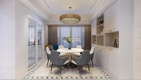餐廳設(shè)計比較簡潔,大理石質(zhì)感的餐桌,加上簡約造型的靠背椅,輕奢的金屬桌腳,淺色墻面再配上歐式吸塑造型的柜門,一切都美得剛剛好。餐邊柜到頂設(shè)計,強大的收納功能,讓客廳不再臟亂雜。