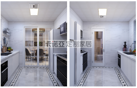 整體廚房采用白色與淺色大理石地磚搭配,波打線花片點綴,將整個廚房色調(diào)提亮,顯得寬敞、視覺豐富,讓人愛下廚。