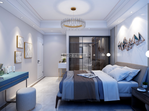 衣帽間設(shè)計在主臥與主衛(wèi)之間,采用透明玻璃移門隔斷,讓主臥視野更為開闊通暢,防止?jié)駳馇秩胍旅遍g及臥室,同時方便洗漱完畢可直接更衣、睡覺。