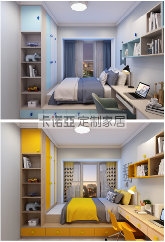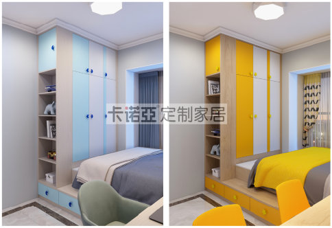 到頂衣柜設(shè)計,滿足孩子日常衣物的收納。男孩房海天藍+印象白+淺色木紋、女孩房活力橙+印象白+淺色木紋的活力色調(diào)的組合,與房間整體配色相契合。衣柜門側(cè)面的開放格,用來展示玩具、孩子所獲得的獎杯及獎狀,以及記錄成長的相冊。