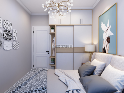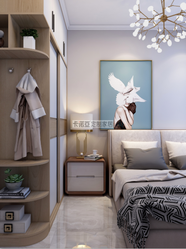 主臥有一面超大的落地飄窗,陽光灑到床上時,就是幸福感洋溢的一刻。房間里有梁柱和角落,定制一個藝術(shù)裝飾柜,擺放一張藝術(shù)裝飾畫和綠植,裝飾柜大小與梁柱正合適,讓角落也成為一道靚麗的風(fēng)景線。