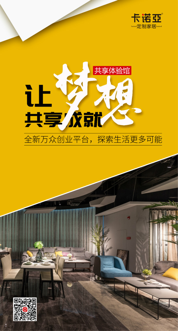 卡諾亞共享體驗館,計劃一年之內在全國各地開設500家,2年開設2000家,打造遍布全國的共享體驗館,與合作商互惠互利、一站式服務,整店輸出,0風險、0加盟費,滿足創(chuàng)業(yè)“新動線”,實現(xiàn)國家倡導的“大眾創(chuàng)業(yè)、萬眾創(chuàng)新”的全民創(chuàng)業(yè)熱潮。
