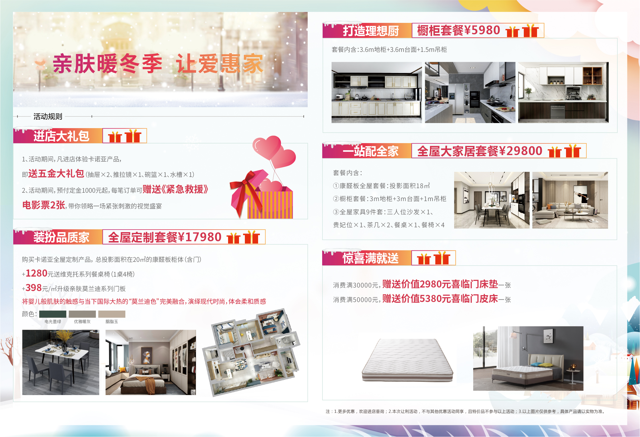除了優(yōu)惠的套餐組合和爆款單品之外,卡諾亞還推出年終歲末的感恩回饋系列活動。活動期間,凡進(jìn)店業(yè)主,贈送五金大禮包(抽屜×2、推拉鏡×1、碗籃×1、水槽×1),預(yù)付定金¥1000起,每筆訂單可贈送視覺大片《緊急救援》電影票2張;此外,再送一波驚喜,消費(fèi)滿¥30000,贈送價值¥2980喜臨門床墊一張;消費(fèi)滿¥50000,贈送價值¥5380喜臨門皮床一張,送這些新房必購剛需品,能為消費(fèi)者減輕裝修壓力,輕松過新年。