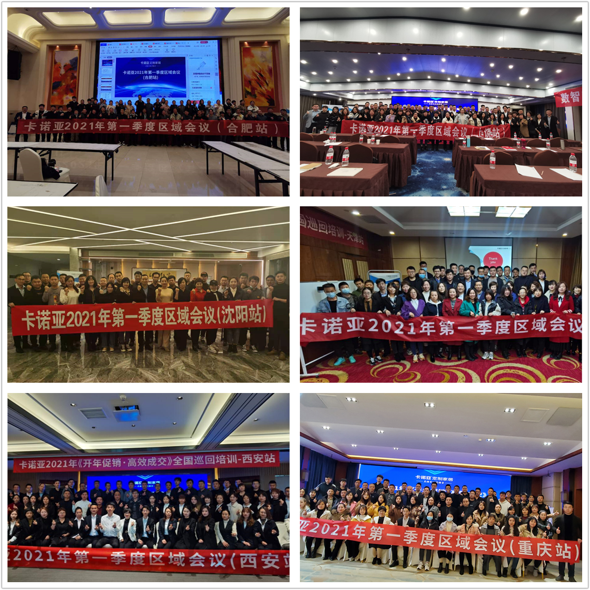 據(jù)悉,卡諾亞定制家居2021年第一季度區(qū)域會議暨開年促銷高效成交全國巡回培訓(xùn),分別在沈陽、西安、天津、太原、重慶、廣州、長沙、武漢、鄭州、濟(jì)南、上饒、合肥等近20個(gè)城市圓滿舉行。