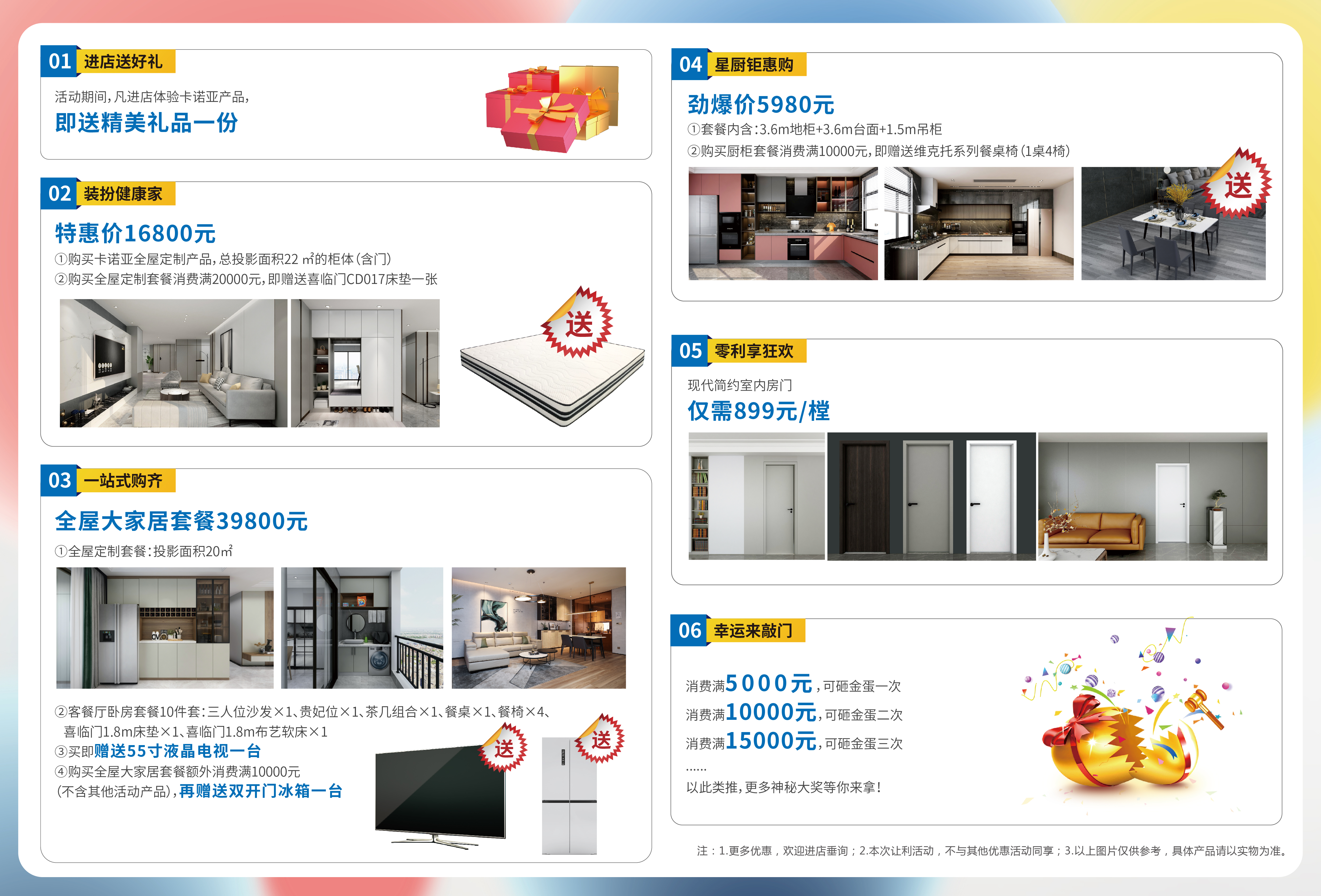 此次“健康定制,為生活加點美好”618聚惠盛典送福利活動,截止6月18日,親臨卡諾亞定制家居當(dāng)?shù)貙Yu店,除了尊享以上四大套餐外,還能搶到眾多驚喜:進店即送精美禮品一份;消費滿¥5000,砸金蛋1次,滿¥10000,砸金蛋2次,滿¥15000,砸金蛋3次……618大促提前引爆,活動詳情請咨詢當(dāng)?shù)貙Yu店,卡諾亞定制家居歡迎你來體驗。