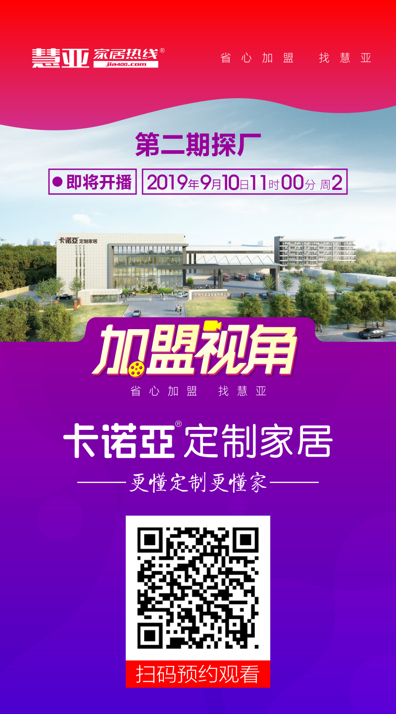 重磅信息?。?!9月10日慧亞家居熱線《加盟視角》將會(huì)正式開播,走進(jìn)家居行業(yè)知名品牌卡諾亞,專業(yè)定制家居18年,全國(guó)1000+專賣店,20余萬(wàn)㎡工業(yè)4.0智造基地,每年服務(wù)百萬(wàn)家庭。本期節(jié)目將全方位揭曉卡諾亞是如何讓加盟商放心賺錢!