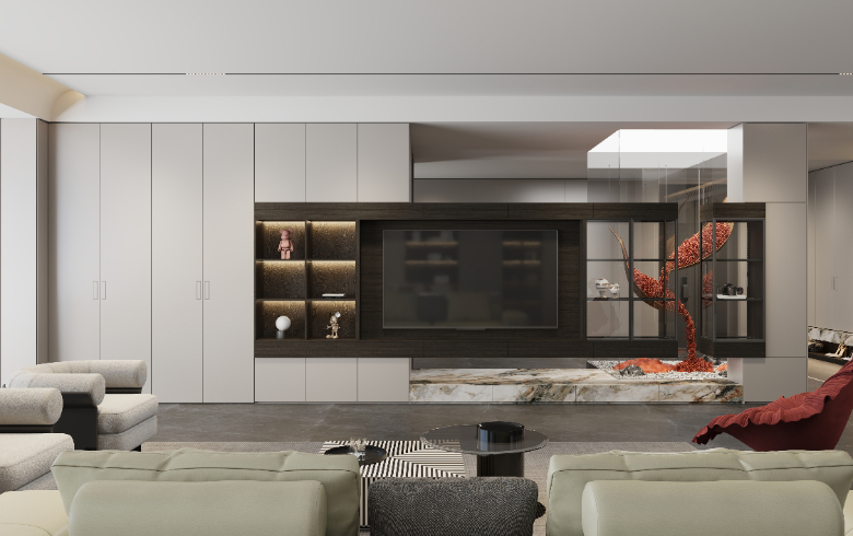 奶白色背板搭配深色開放格,輕松打造高級感電視背景墻;底部懸空放置植物與擺件,讓業(yè)主在閑暇之余,感受到空間帶來的呼吸感。
