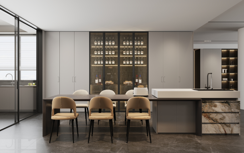 島臺餐桌形成一個整體,讓餐廳的功能性大增。這里不限于用餐,還能作為日常休閑的茶吧或西廚料理烘焙臺,甚至可作為臨時辦公場所,相較于單獨的餐桌,該設計讓空間利用率更高。
