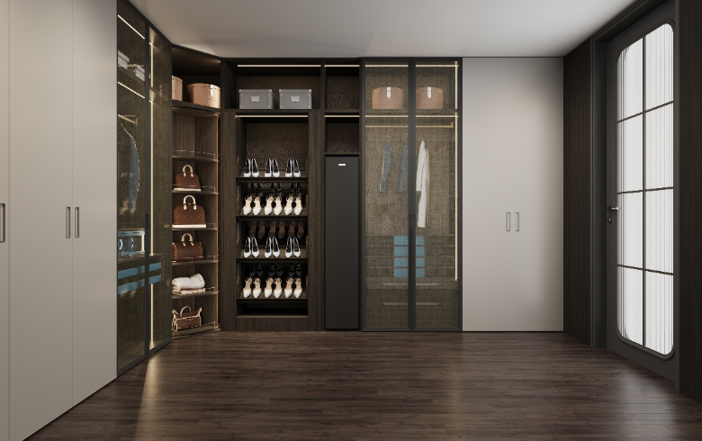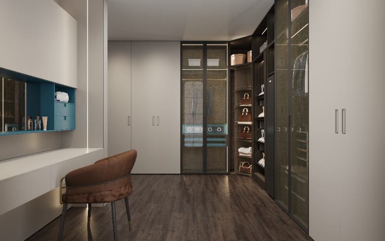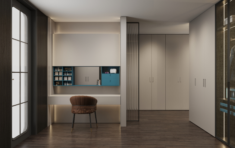 衣帽間設置梳妝臺,模塊化功能分區(qū),秩序井然,兼具實用性與視覺美,新穎別致的開放格設計,滿足Amy放置常用的護膚化妝品。