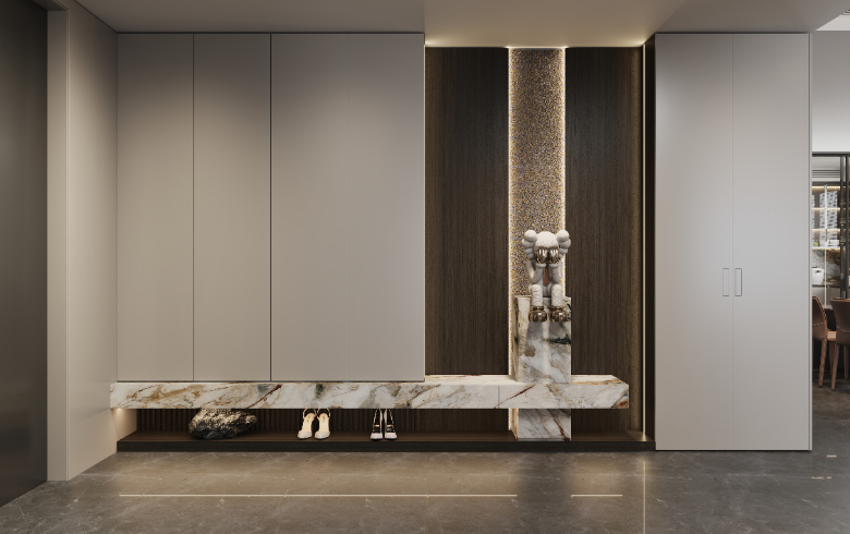 通頂玄關柜橫向延伸,收納翻倍。底部懸空方便換鞋,提升入門整潔度,地臺加持,高級加倍;中部鏤空開放,擺設飾品,放置出門必備物,生活的并井有條從歸家開始。