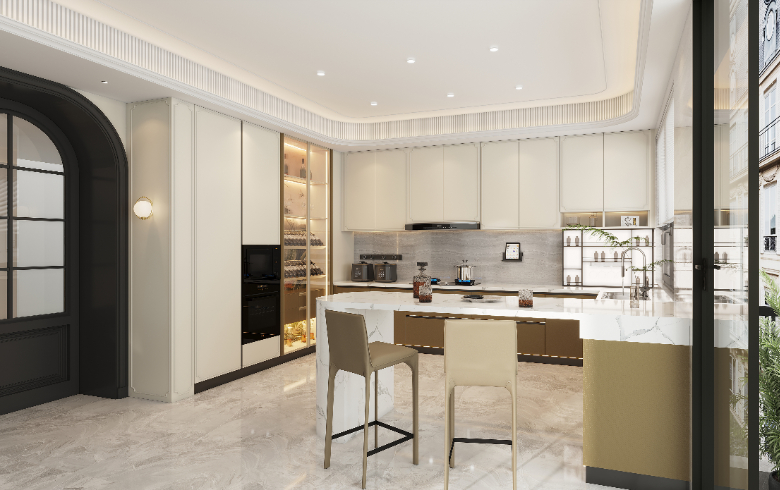 “烹"然心動的廚房美學,融入法式經(jīng)典特色,感受煙火烹飪的慢時光。開放式餐廚,L型櫥柜,煙火氣、精致感,樣樣不落下。地柜延伸出一個輕盈的小吧臺,可以一邊品飲小酌,一邊等待料理煮好端上桌,非常浪漫的享受~