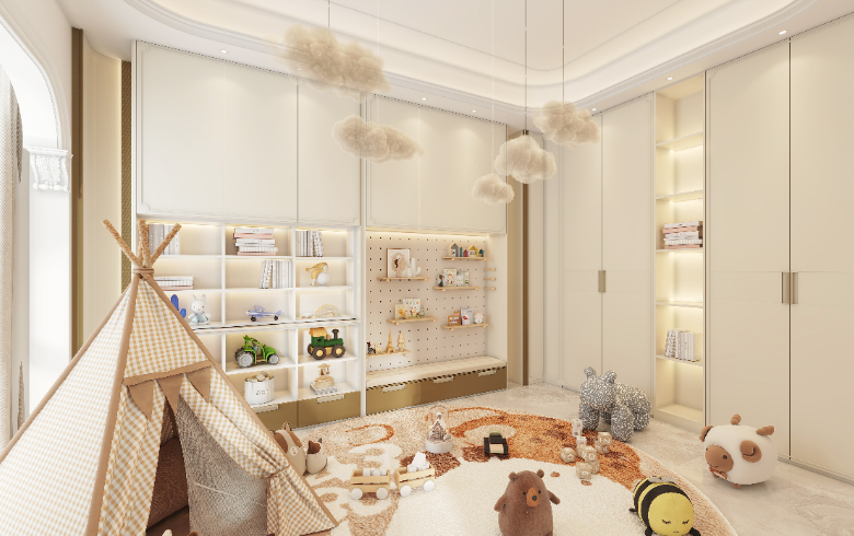 玩樂區(qū)放滿各種洋娃娃,守護天真爛漫的童年。暖色調現(xiàn)代感的兒童房,大面積的落地窗,明快的配色,既能培養(yǎng)孩子開闊的胸襟,也有利于增加他的擴散性思維和創(chuàng)新意識。